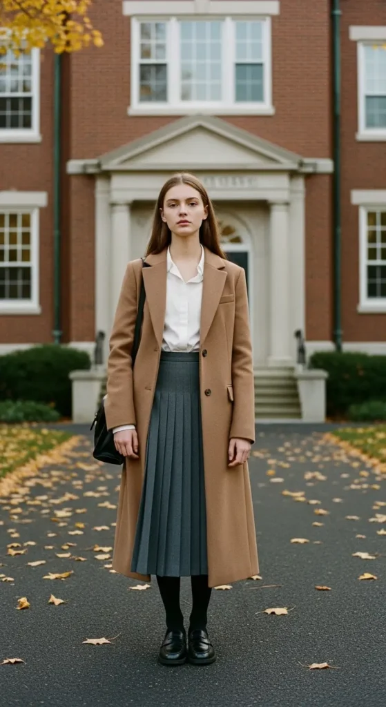 The camel coat is the silent power move. Throw it over a basic white button-up and pleated skirt, and suddenly your school outfit looks polished, intentional, and classy.