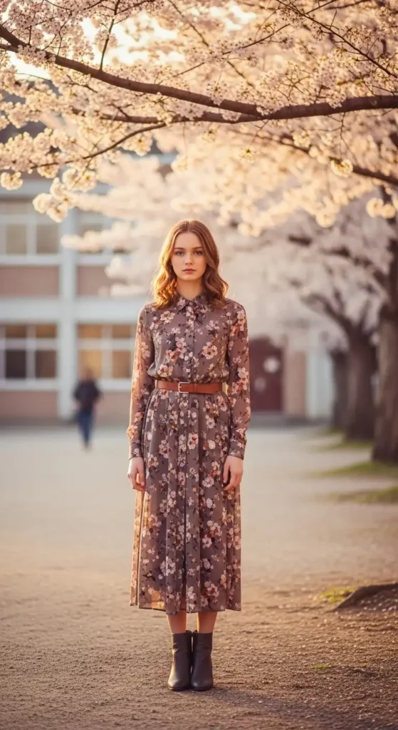 dress in a darker palette—like navy or maroon—and cinch the waist with a leather belt. Add tights and ankle boots. It’s giving royal garden party, but make it school-appropriate. Feminine without being fragile, this look has that quiet romance vibe that says you’re poetic, stylish, and probably the smartest in the room.