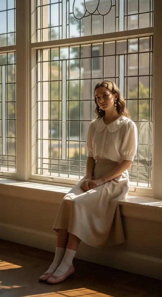A Peter Pan collar brings innocence, while a midi skirt adds sophistication. This unexpected combo channels old-school princess charm—think young Queen Elizabeth—with a modern twist. Add pearl earrings and flat slingbacks for balance. Whether you’re heading into a group project or a debate, this look keeps you soft yet commanding. It’s modest, refined, and quietly confident. Plus, it photographs like a dream.