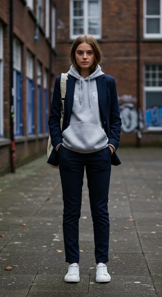 This modern royal remix hits hard. Pair a gray hoodie under a fitted navy or plaid blazer for a high-low contrast that feels edgy and intentional. Add straight-leg trousers and sneakers or loafers. It’s like Meghan Markle meets street-style genius. Casual but calculated, this look bridges traditional prep with Gen Z cool. You’ll look like you just stepped off the Eurostar, not a school bus.