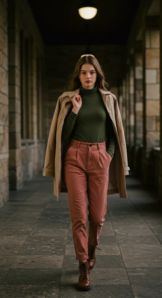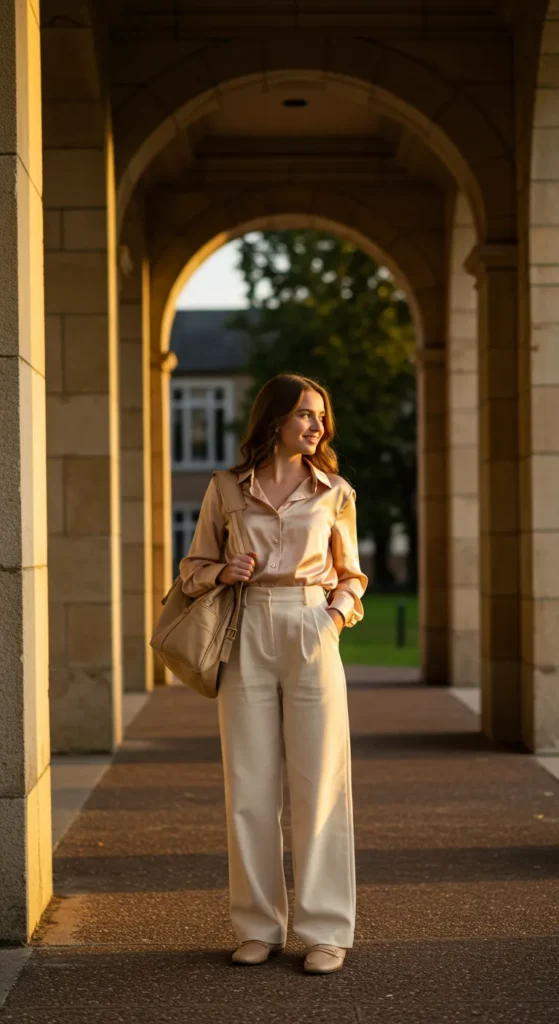 There’s power in fluidity. A silky, slightly oversized blouse tucked into high-waisted wide-leg pants is both commanding and soft. Go with champagne, cream, or blush tones. Add loafers or pointy-toe flats and a structured bag. This outfit feels rich—like old money rich—but it’s easy to pull off. It’s how you walk into class and own the room without raising your voice.