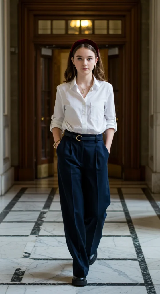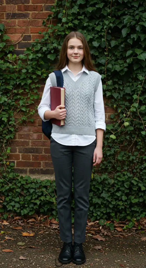 Layer a fitted knit or plaid vest over a white oxford shirt, and suddenly you’re channeling every elite prep school fantasy. Add straight trousers, loafers, and a confident stride. This look is no-nonsense with a side of cool. Think Princess Diana on a casual day—book-smart and fashion-forward. Sharp collars and clean lines make this outfit perfect for school days that demand your A-game.