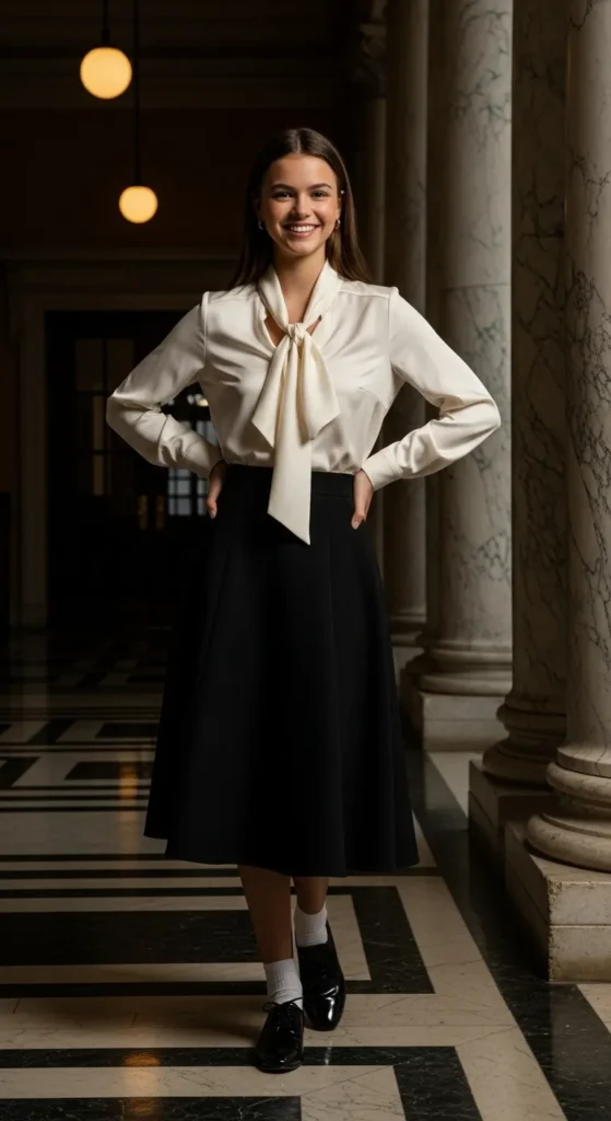 Add a little drama. A silky blouse with a neck-tie or scarf detail makes your whole outfit look like you came from a royal press event. Pair it with flared pants or an A-line skirt. Minimal makeup, slick hair, and a bold bag bring it home. This look turns heads without being flashy—elegant, mysterious, and slightly nostalgic, like you’re the protagonist of your own period drama.