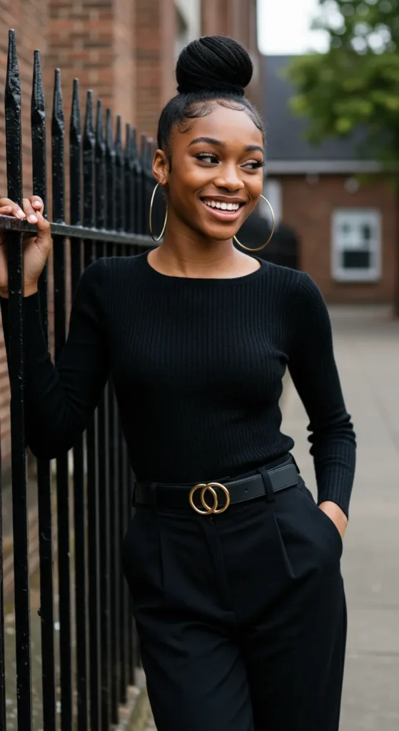 All-black doesn’t mean boring. In fact, when styled right, it’s a power move. Try a black knit top, black high-waisted trousers or skirt, and gold accents: earrings, a belt buckle, maybe a hair clip. Add structured shoes, and you’ve got a royal-level glow-up. This look oozes confidence and keeps you looking sharp without effort. It’s minimalism with a crown—and your vibe says, “watch me.”