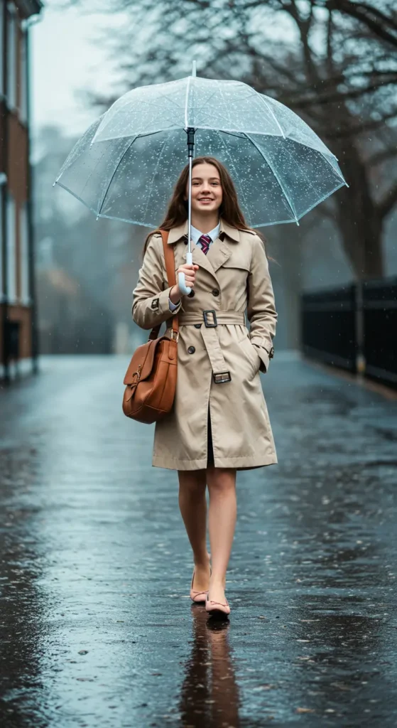 skirt—and instantly you look ten times more polished. Add ballet flats, a hair bun, and a neutral tote bag. It’s French girl meets Windsor vibes. Rainy day? Even better. You’ll be gliding through puddles looking like you just stepped off a Vogue shoot. It’s not basic. It’s iconic.
