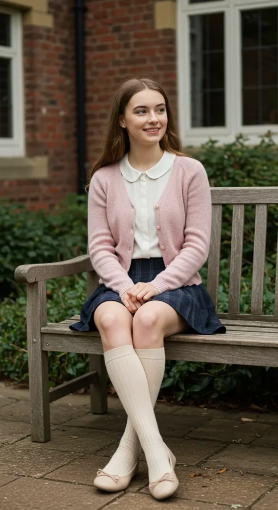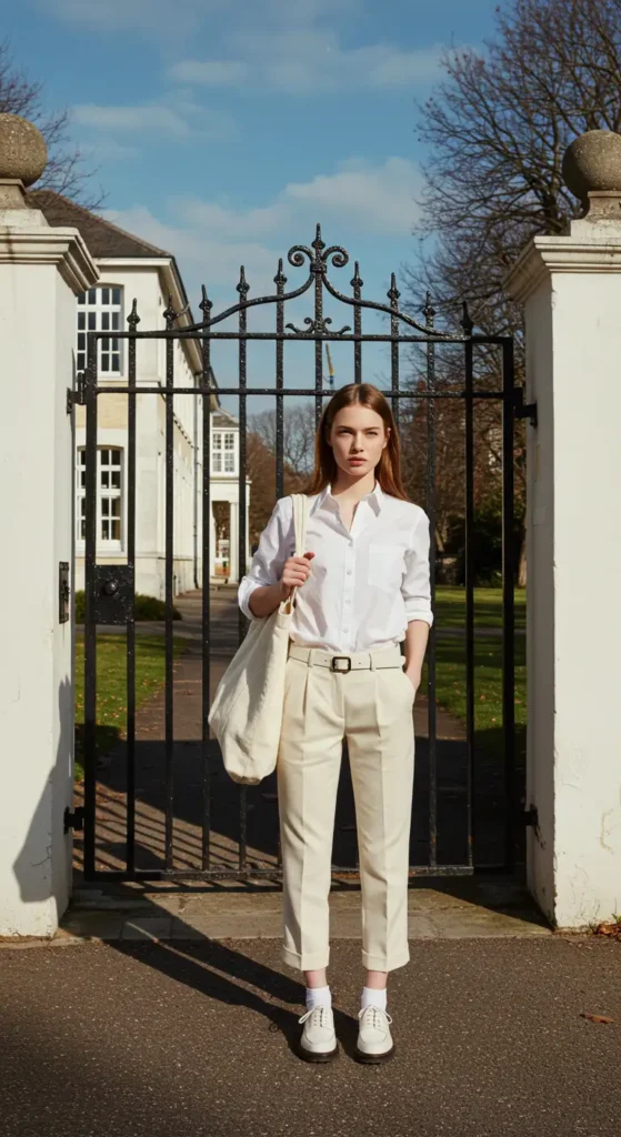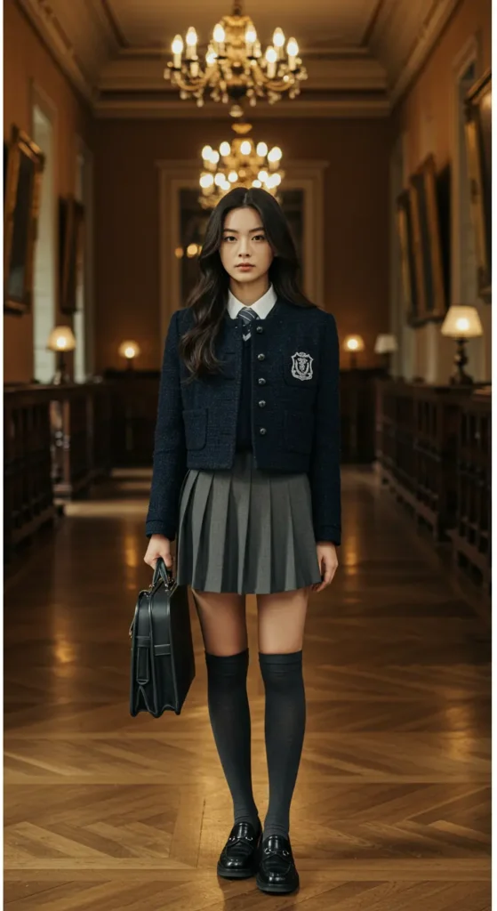 This one is bold, British, and beautiful. A cropped tweed jacket—think Chanel vibes—over a crisp blouse and pleated skirt creates an ultra-polished school-girl look with major royal influence. Add tall socks, loafers, and a leather satchel. With the right posture and a neutral palette, this outfit feels like it walked straight out of Buckingham Palace and into your school corridors. It’s heritage, updated.
