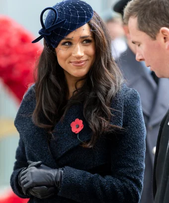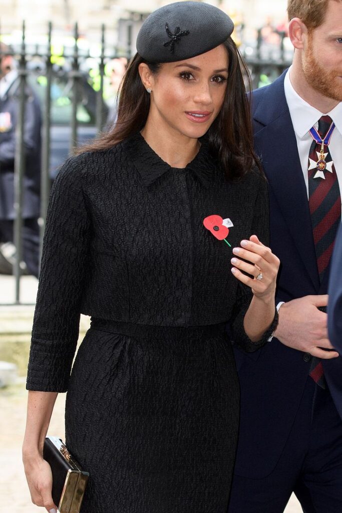 Meghan opted for subtle refinement in her navy Stella McCartney coat for the commemorative service. The Duchess chose a streamlined pillbox hat that complemented her flowing brunette waves tastefully. Her lone red poppy brooch gave the traditional symbolic flourish, and her restrained approach showed proper respect for this important memorial ceremony