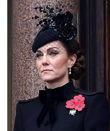 dress defined respectful sophistication for Remembrance Day services. The Princess of Wales’s sharply-cut silhouette was matched with an elaborate fascinator in dramatic netting with floral details. Pearl drop earrings brought classical elegance, while several red poppies commemorated fallen servicemen magnificently.