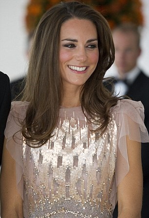 Kate channels Cinderella glamour in her breathtaking turquoise pleated gown featuring delicate lace cap sleeves and a sparkling crystal belt that cinches her waist beautifully.