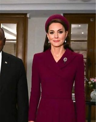 Kate exudes regal sophistication in her rich burgundy coat dress featuring a tailored silhouette with long sleeves, complemented by a matching pillbox hat and decorative brooch for formal daytime engagements.