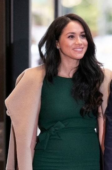 Meghan wore more muted emerald colors in her sleeveless sheath dress for a charitable outing. The Duchess chose a body-skimming shape with demure belt detailing that defined her waistline beautifully. Her loose waves and camel