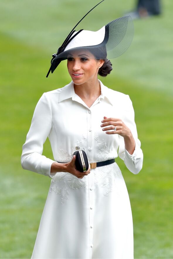 Meanwhile, Meghan brings contemporary minimalism with her tailored white shirt dress and dramatic black and white fascinator featuring bold sculptural lines. Both Duchesses demonstrate contrasting approaches to Royal Ascot elegance, with Kate embracing romantic femininity while Meghan opts for modern sophistication in their pristine white ensembles.
