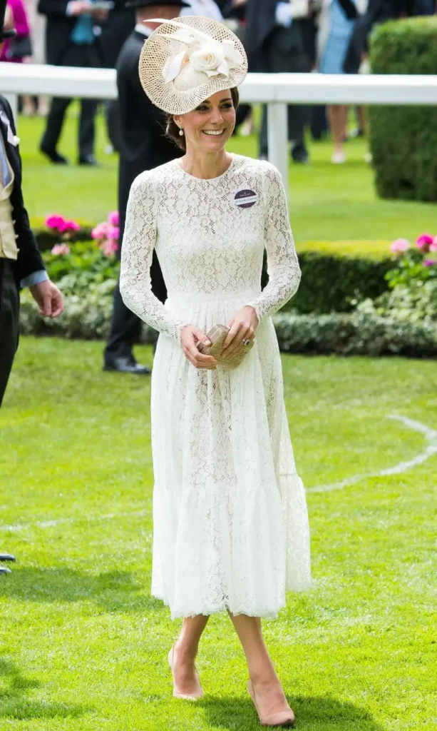 Kate showcases timeless sophistication in her stunning white lace midi dress, featuring intricate floral detailing and long sleeves paired with a woven fascinator adorned with delicate roses.