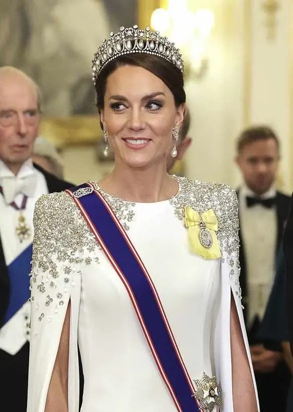 Kate commands regal elegance in her pristine white cape gown adorned with intricate crystal embellishments and the Cambridge Lover’s Knot tiara, complete with ceremonial sash and royal orders.